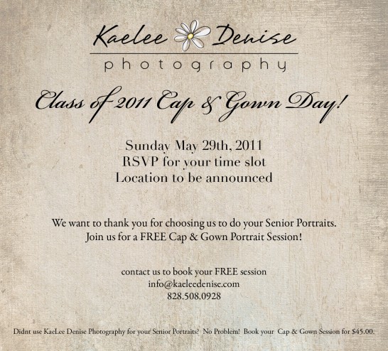 Class of 2011 – We are giving all our seniors who used KaeLee Denise Photography for their Senior Portraits a FREE Cap & Gown Session! Limited number of slots please email us to book your session!