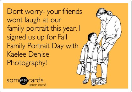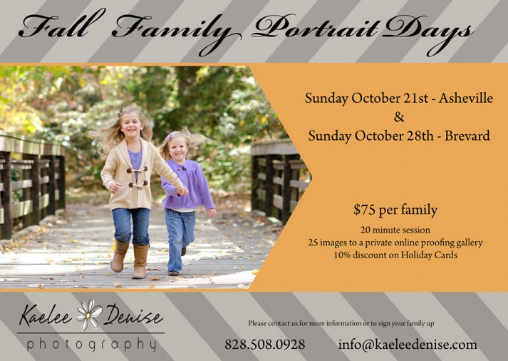WOW! I got so excited while creating this flyer for Fall Family Portrait Days. My favorite time of the year. Cool crisp air, the amazing colors, leaves crunching under your feet. Fall Family Portrait Days are only 3-months away.