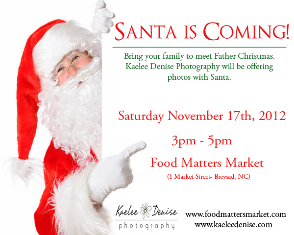 Bring your family to visit Father Christmas at Food Matters Market (1 Market Street, Brevard) on Saturday November 17th, 2012 from 3pm- 5pm.